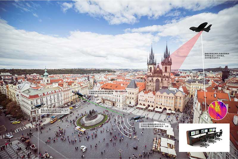 群體性事件或暴恐事件發(fā)生時(shí),鷹眼二號(hào)系留型六旋翼無(wú)人機(jī),可搭載系留模塊和偵察取證,迅速到達(dá)群體性事件或暴恐事件附近,實(shí)施空中秘密偵察取證,為日后定罪量刑提供圖證;當(dāng)現(xiàn)場(chǎng)通訊設(shè)施被暴恐分子破壞后,可搭載通信中繼模塊,實(shí)施緊急通信信號(hào)中繼,保障指揮調(diào)度能力。